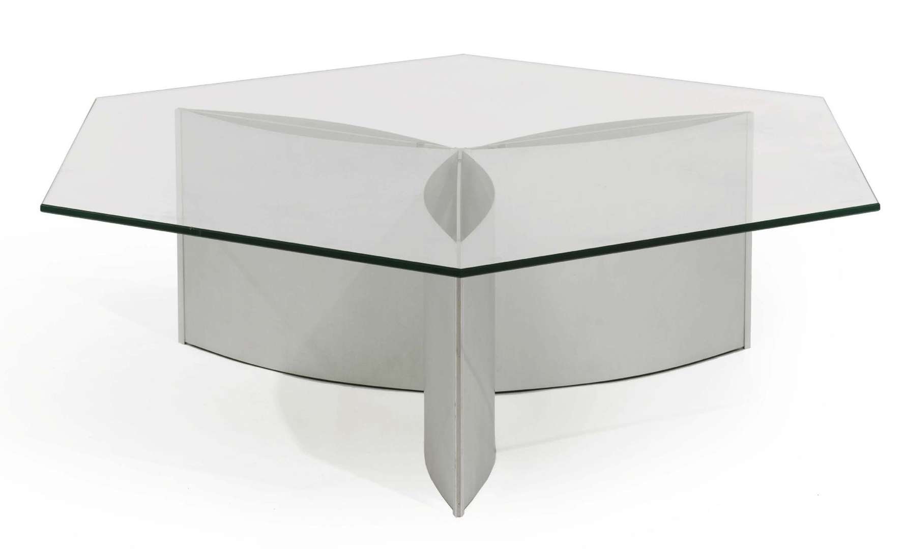 Plateau hexagonal (d'origine) en verre reposant sur un pied trilobé en aluminium brossé.