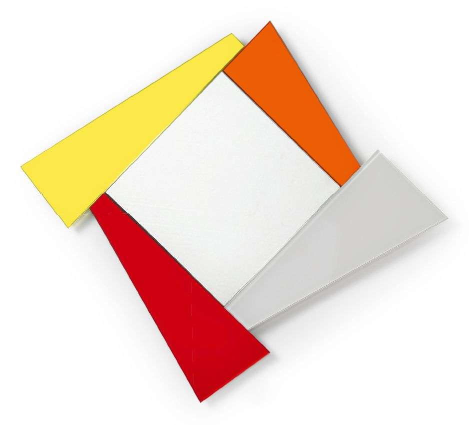 MIROIR CARRÉ Encadrement de quatre triangles isocèles tronqués en cristal laminé coloré.