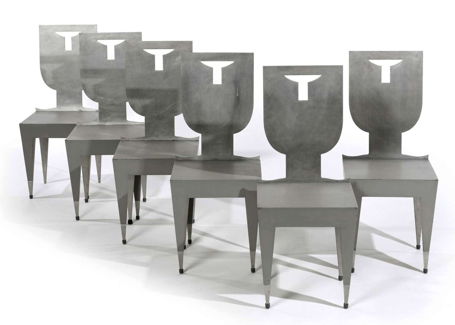 SUITE DE SIX CHAISES En fonte d'aluminium et bois laqué gris. Dossier écusson ajouré, large assise reposant sur des pieds effilés.