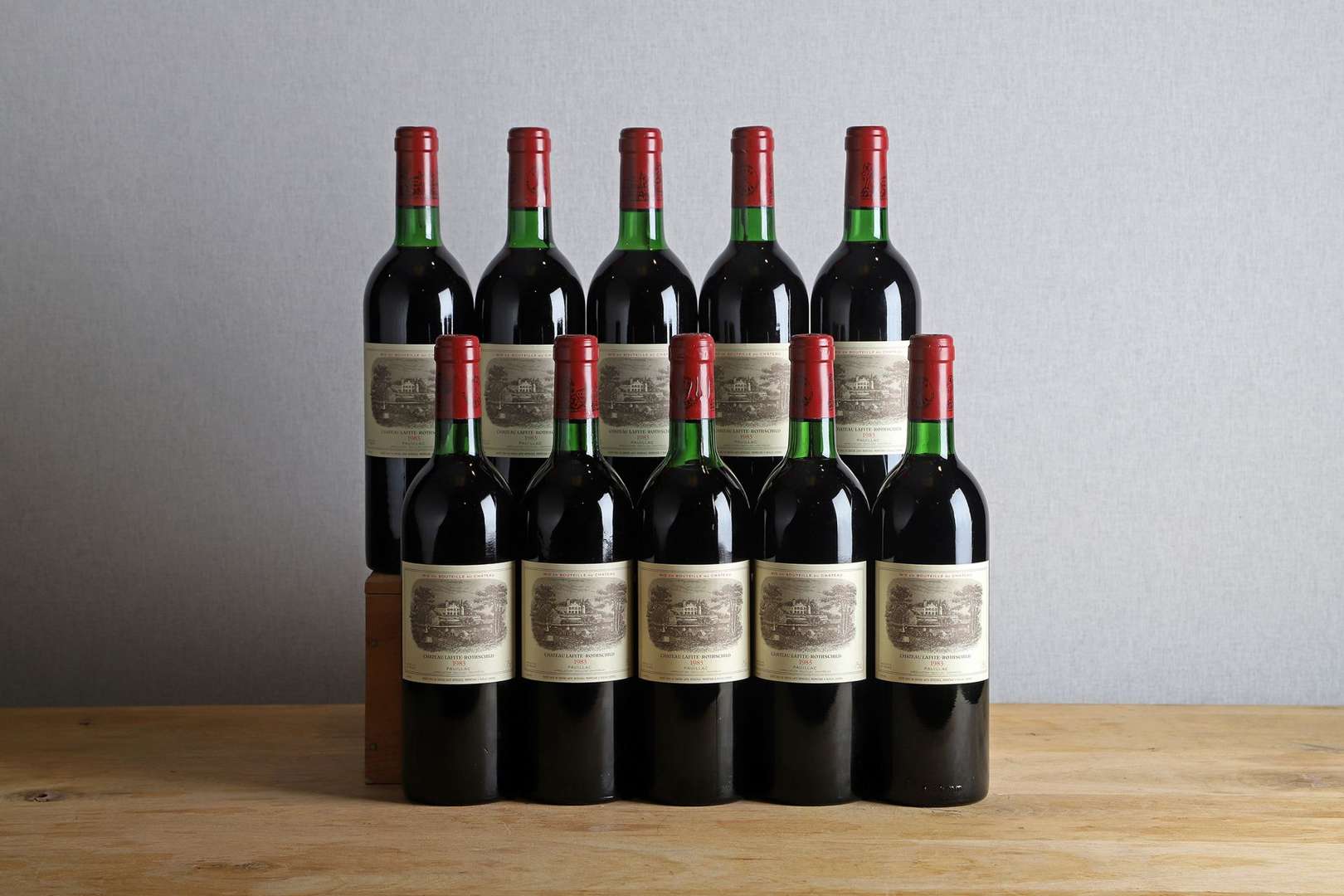 10 B CHATEAU LAFITE-ROTHSCHILD (Caisse Bois d'origine remise à l'acquéreur) (3 B.G| 2 B.G.-. 4 T.L.B. et 1 H.E.+| 1 capsule gonflée et légèrement corrodée| 1 c.a. au sommet) - 1983 - GCC1 Pauillac