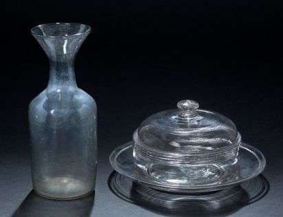 Confiturier et son plateau en verre soufflé et moulé, décor de filets, trace de pince.