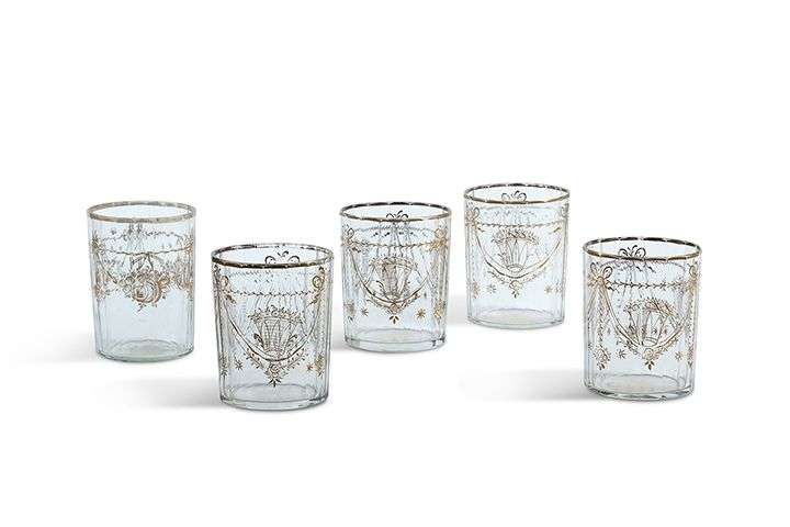 Suite de quatre gobelets de forme tronconique en verre incolore taillÈ en facettes. DÈcor ÈmaillÈ dorÈ de corbeilles de fleurs, chutes de rubans et frises de feuillages. Bord ornÈ d'un filet dorÈ