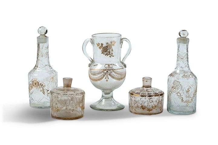 - Paire de flacons bas en verre incolore en verre soufflÈ, taillÈ en facettes, gravÈ et ÈmaillÈ dorÈ d'un dÈcor floral
