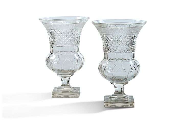 Paire de vases MÈdicis en cristal taillÈ ornÈ d'un dÈcor de pointes de diamants, col ÈvasÈ ornÈ de croisillons, la panse ‡ dÈcor de feuilles. PiÈdouche ‡ pans, socle de forme carrÈe