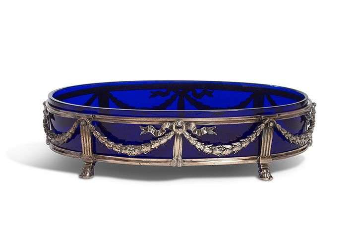 Grande jardiniËre de table de forme ovale. Le corps ajourÈ en argent 950 milliËmes ciselÈ d'un dÈcor de guirlandes de lauriers, noeuds de rubans, colonnes cannelÈes terminÈes par des pieds de cervidÈs. Doublure intÈrieure en verre bleu