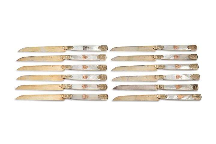 Suite de douze couteaux ‡ fruits en vermeil ciselÈ de palmettes et manche en nacre