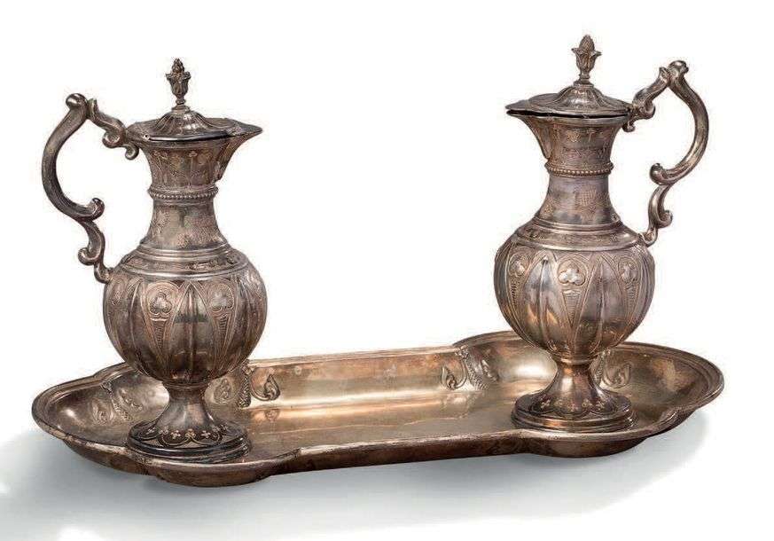 • PAIRE DE BURETTES COUVERTES D'ÉGLISE en argent et un plateau en vermeil