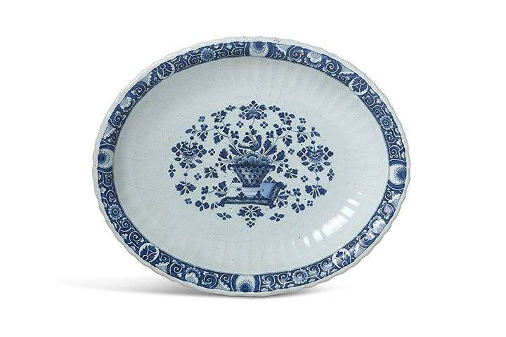 Bassin de forme ovale ‡ panse cÙtelÈe en faÔence ‡ dÈcor en camaÔeu bleu d'un corbeille fleurie ‡ l'oiseau au centre et d'une bordure florale.