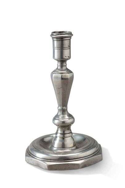 FLAMBEAU DE TABLE en étain mouluré à fût tronconique et binet cylindrique.