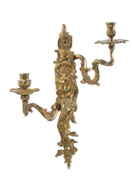 Paire d'appliques aux enfants souffleurs en bronze ciselÈ et dorÈ. La platine est ornÈe d'un visage d'enfant joufflu, et se termine par des feuillages et des roses. Il s'en Èchappe deux bras de lumiËres mouvementÈs
