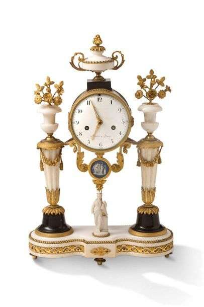 en marbre noir, blanc, bronze ciselÈ et dorÈ. Le cadran ÈmaillÈ blanc prÈsentant les heures en chiffres arabes est signÈ ´ Marlier ‡ Paris ª. Il est supportÈ de part et d'autre par des colonnes cannelÈes fuselÈes ‡ dÈcor de vases fleuris. SurmontÈ d'un vase ‡ l'antique en partie supÈrieure, il est ornÈ d'un mÈdaillon dans le go˚t Wedgwood en partie infÈrieure. Base de forme oblongue, pieds toupies