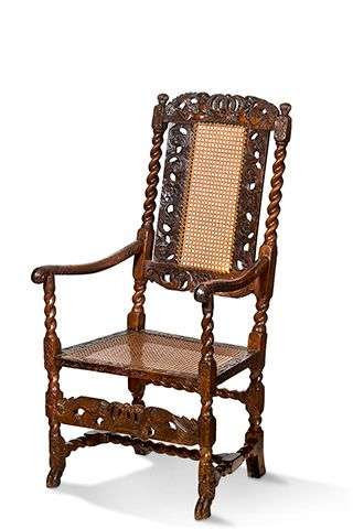 Chaise en bois naturel moulurÈ et sculptÈ ‡ haut dossier, montants ‡ colonnes torses, traverse supÈrieure ‡ dÈcor d'une couronne fermÈe
