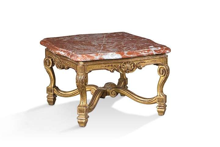 en bois moulurÈ sculptÈ dorÈ, la traverse ‡ dÈcor de coquilles et de feuilles d'acanthe, il repose sur des pieds ‡ enroulements rÈunis par une entretoise en X