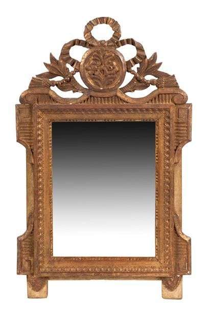 MIROIR en bois mouluré sculpté doré orné d'un fronton ajouré à noeud rubanné Style Louis XVI
