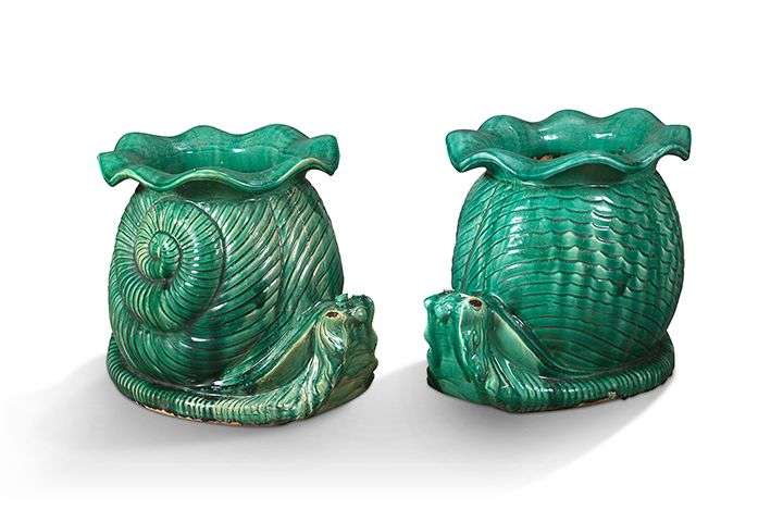 Paire de vases en terre cuite ÈmaillÈe vert ornÈ de deux escargots