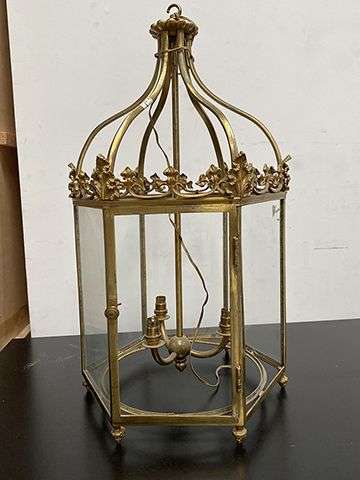 Lanterne de forme hexagonale en laiton et bronze dorÈ. Suspension de forme mouvementÈe. Partie supÈrieure ornÈe de feuilles d'acanthe et feuillages. Lustrillon ‡ trois lumiËres