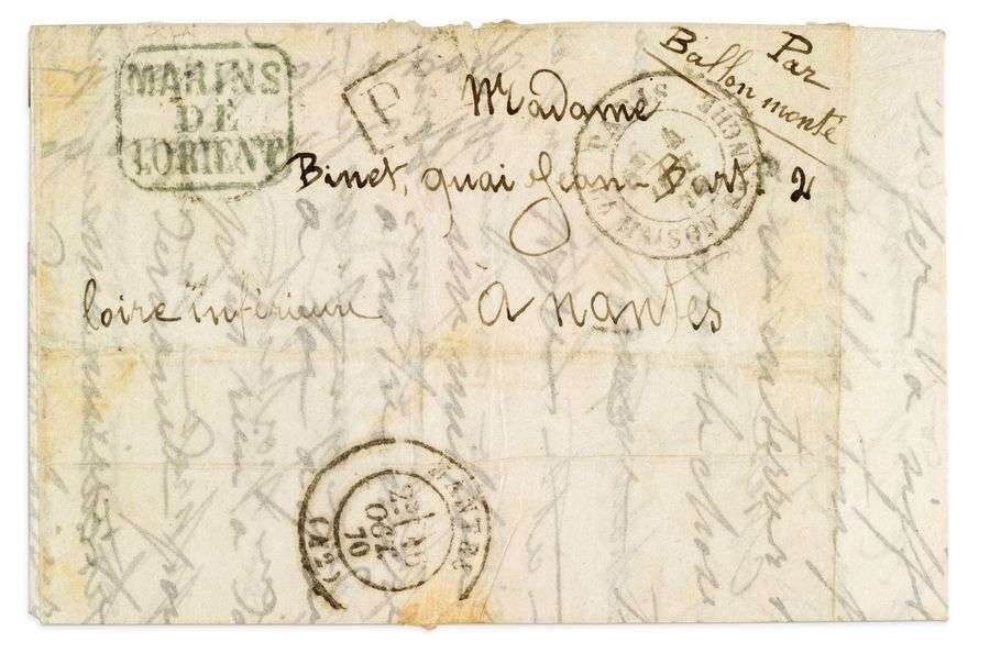 lettre en franchise avec griffe encadrée en bleu MARINS DE LORIENT et griffe P.P. encadrée en noir, Paris La Maison Blanche, pour Nantes.