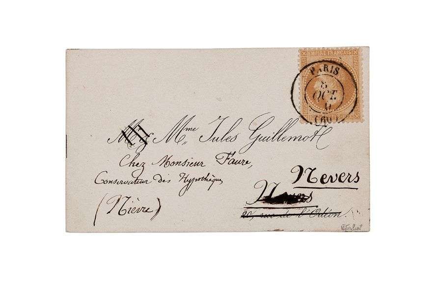 10c lauré obl. rare càd type 15 PARIS (60) 8 OCT. 70 sur petite carte datée du 7 octobre 1870 pour NEVERS sans arrivée. LE NOM DENOMME N°2 probable. Superbe