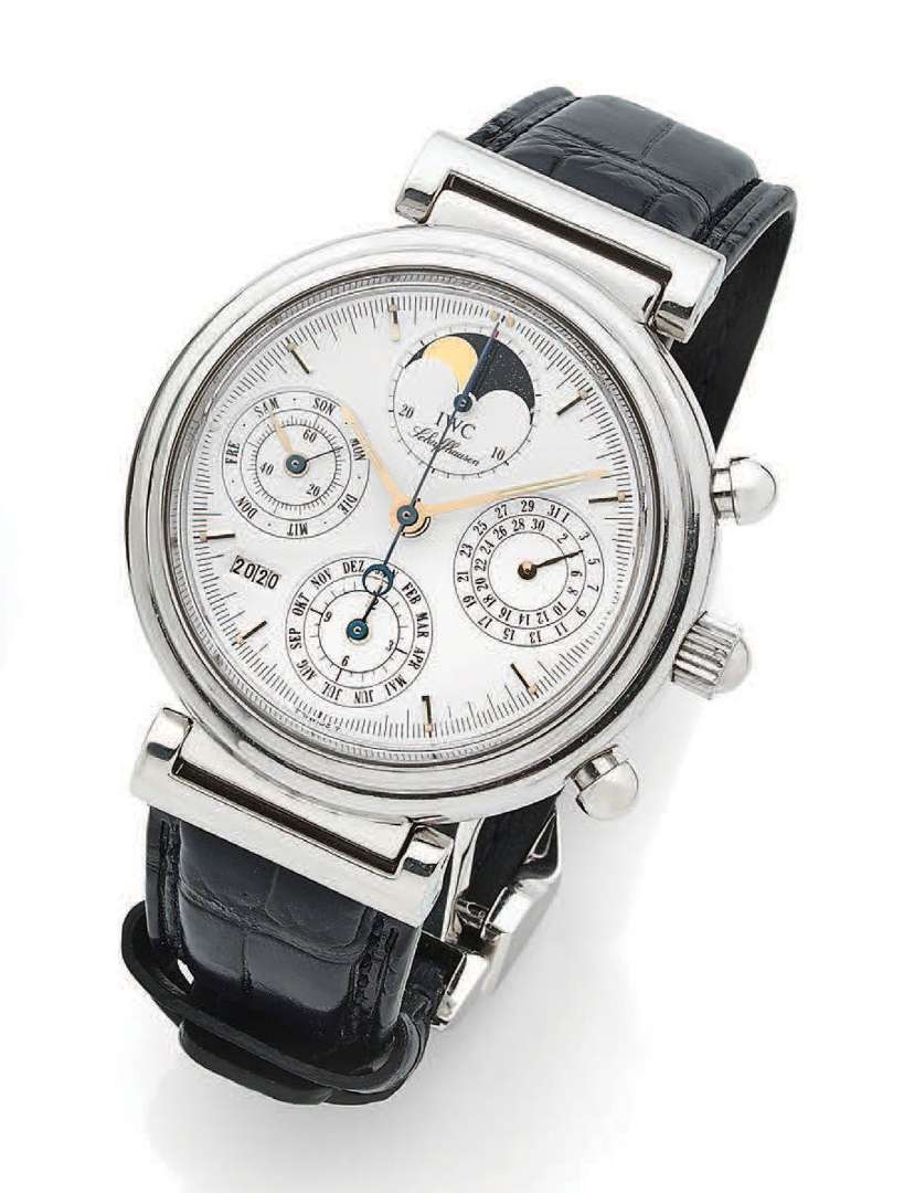 Cadran blanc avec index bâtons appliqués, aiguille luminescentes, cadrans auxiliaires pour les indications du quantième perpétuel, trois compteurs pour la fonction chronographe, ouverture à guichet pour les années bissextiles, phases de la lune, signé