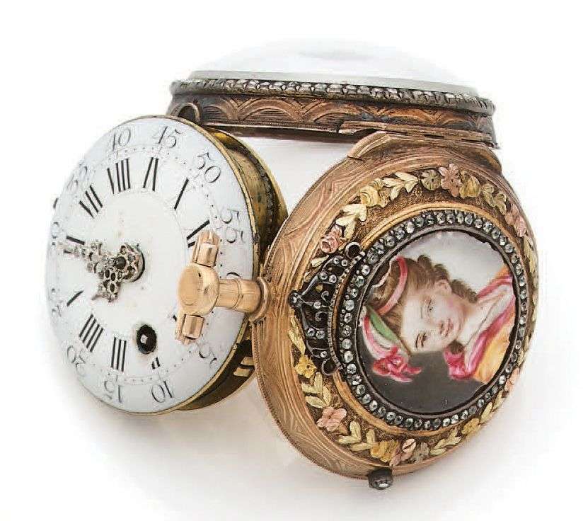 Montre en or avec médaillon en émail polychrome