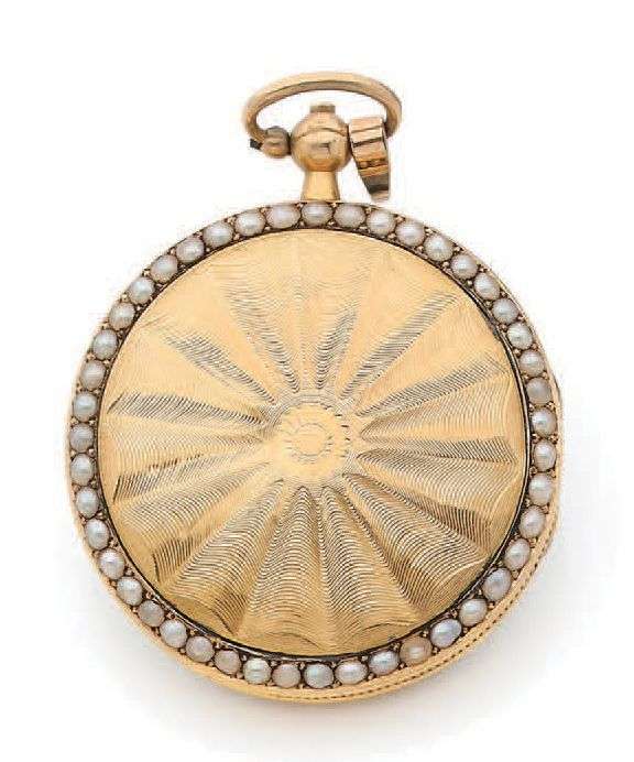 Boîtier rond sur charnière, entourage de demi perles recto et verso, la carrure cannelée, le dos guilloché.