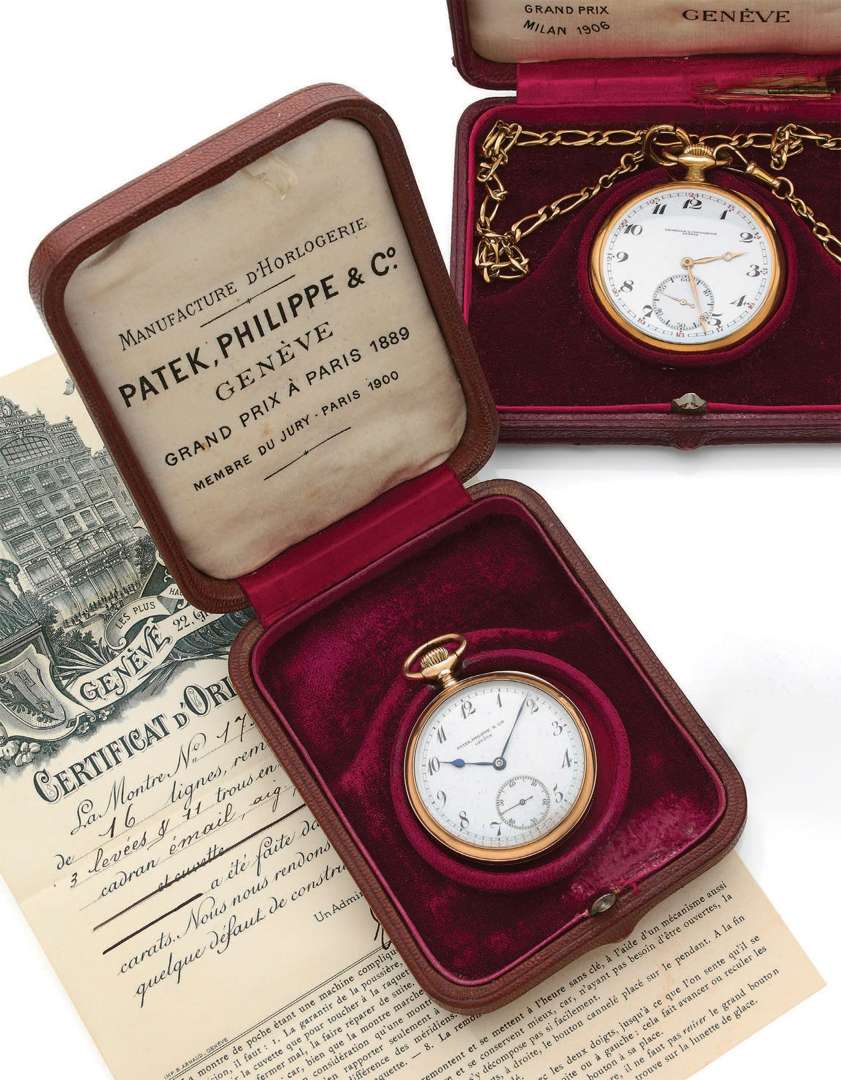 Accessoires accompagnée d'un écrin de la maison Patek Philippe et un certificat d'origine sur lequel la mention «boîte ... cuvette ... fond» a été rayé d'un trait noir.