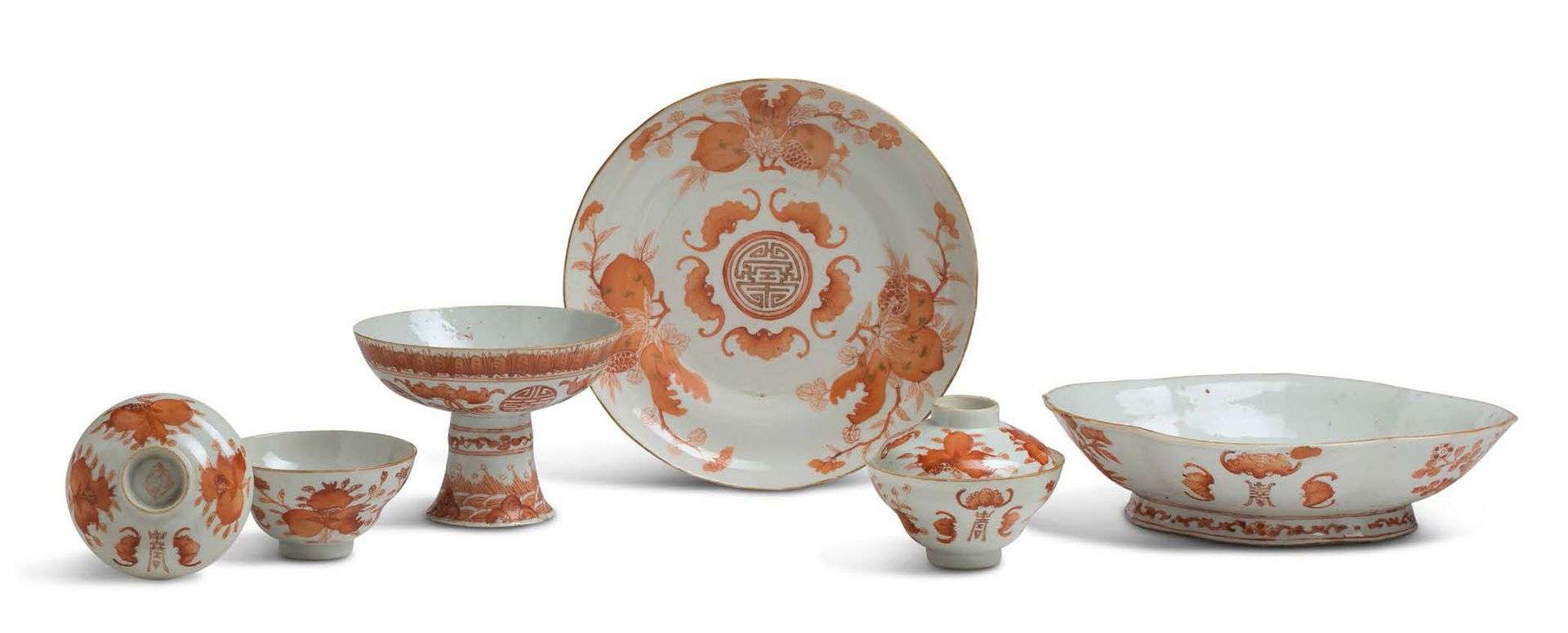 Ensemble comprenant une paire de coupes couvertes, un ravier, une coupe sur piédouche et une assiette, en porcelaine émaillée corail, à décor de chauves-souris, grenades, citrons digités dits «mains de Bouddha», pêches de longévité, caractère shou (longévité) et double-bonheur. Marque Tongzhi sur la base de l'assiette
