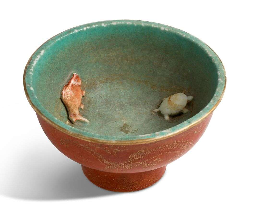 Coupe sur petit pied en porcelaine, le pourtour émaillé corail à décor de rehaussé d'or de dragons poursuivant la perle sacrée parmi des nuages, l'intérieur orné de deux poissons et d'une tortue en relief reposant sur un fond turquoise. Marque Daoguang sur la base.
