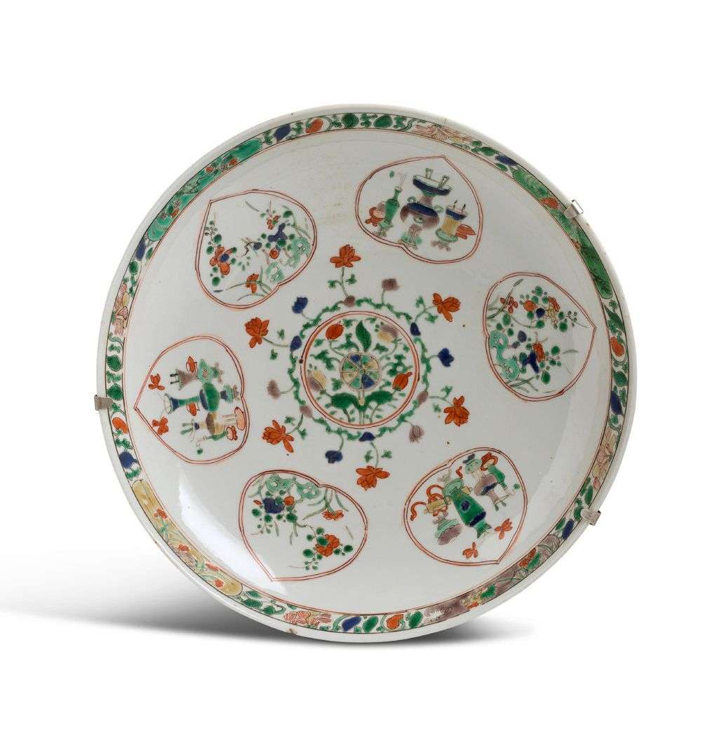 Coupe en porcelaine et émaux de la famille verte, à décor en médaillon central d'une composition florale, entourée de feuilles de muriers ornés d'objets mobiliers et fleurs.