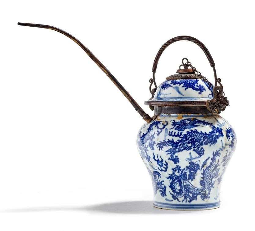 Pipe à eau en porcelaine bleu et blanc à décor de dragons. Avec marque apocryphe Qianlong sur la base.