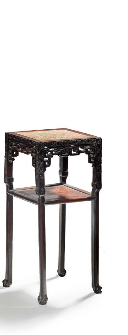 Sellette quadrangulaire, reposant sur des pieds griffés, la ceinture ajourée de motifs de grecques et rinceaux feuillagés. Le dessus en marbre.