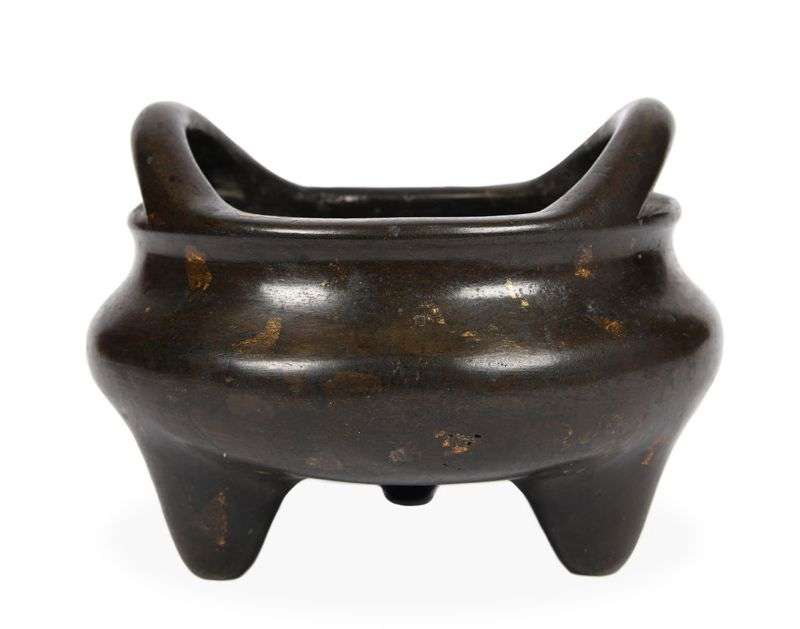 Brûle-parfum tripode en bronze de patine brune, légèrement parsemé d'or, surmonté de deux anses ajourées. Marque apocryphe Xuande sur la base.