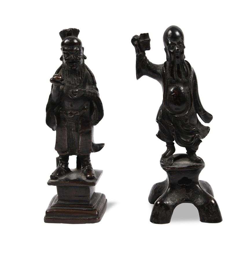 Deux statuettes en bronze de patine brune, représentant un Zhoulao, anciennement laqué, tenant le livre de la loi | et un dignitaire formant porte-baguettes à encens, versant de l'alcool dans une coupe.
