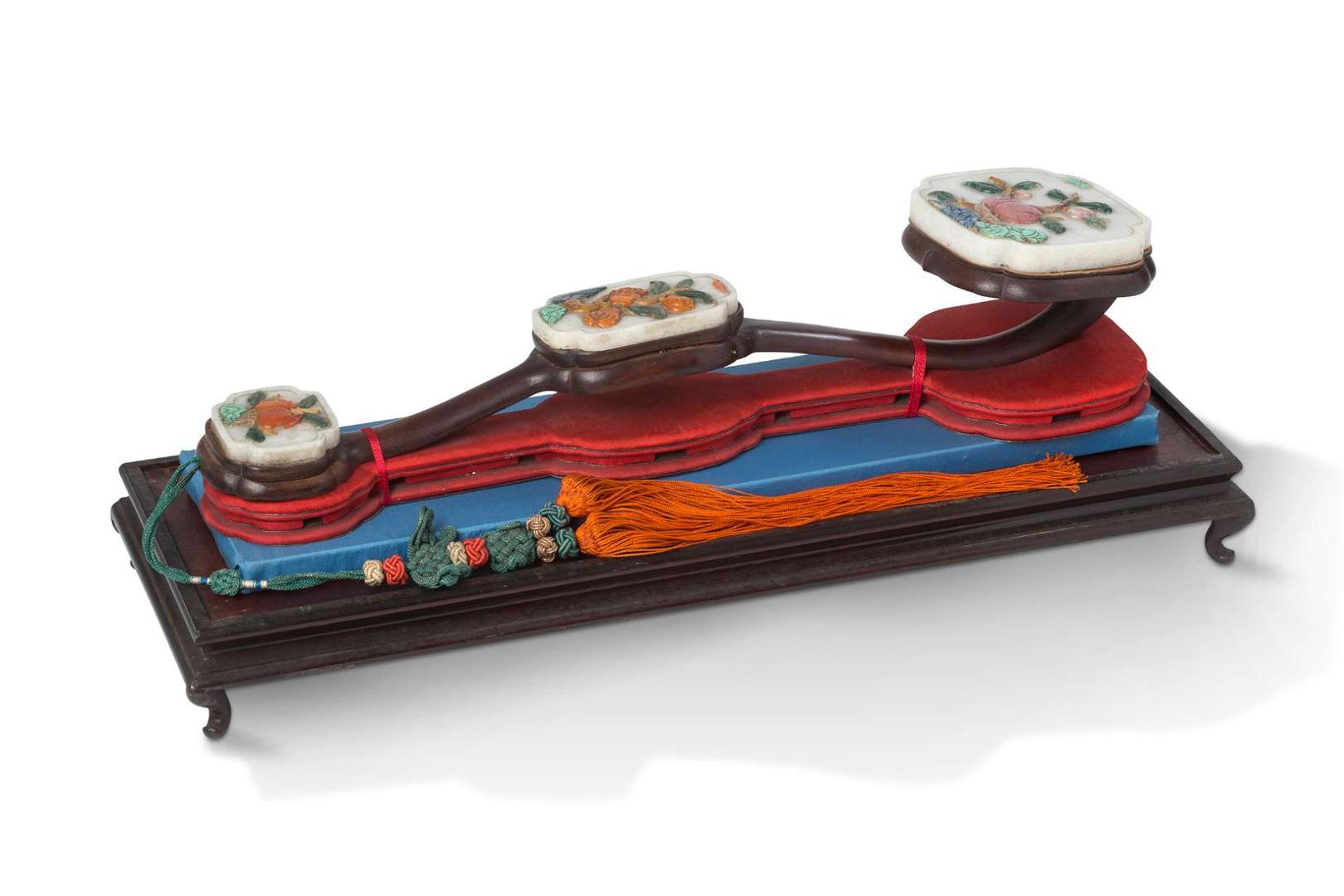 Sceptre ruyi en bois orné de trois médaillons en jade, sertis de fruits et végétaux, en tourmaline, lapis-lazuli, turquoise, jade, ambre. Avec son écrin.