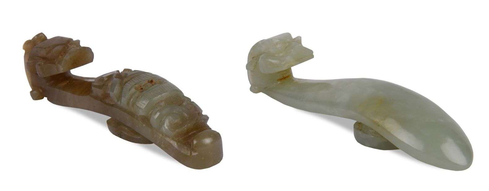Deux fibules, l'une en jadéite à décor de dragon, une autre en jade céladon sculpté d'un dragon et un objet mobilier.