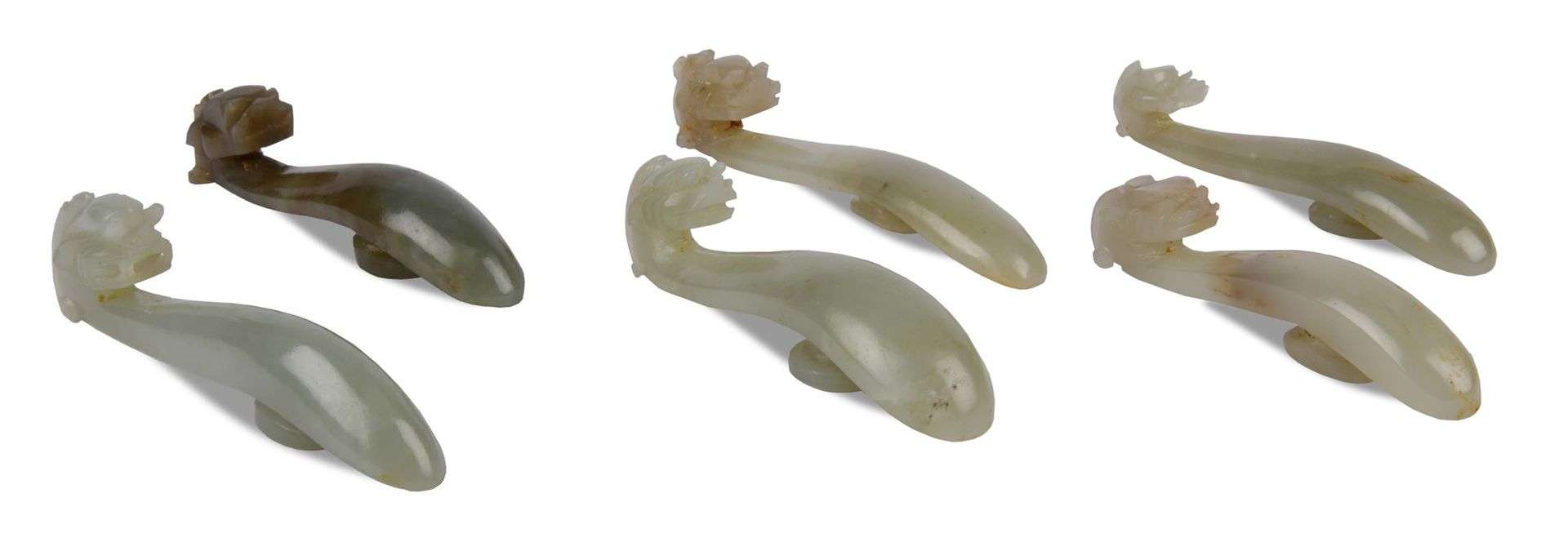 Lot de six fibules en jade céladon et vert clair, à décor de dragons.