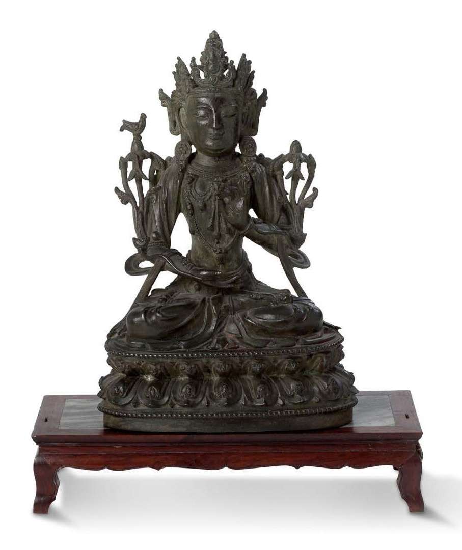 Statuette en bronze de patine brune, à légère traces d'oxydations, représentant Avalokiteshvara, vêtu du dotil, assis en méditation sur un lotus, effectuant le geste de l'enseignement (Vitarka Mudra), la réminiscence d'Amitabha dans la coiffe. On y joint un petit socle en bois de rose et pierre de rêve.