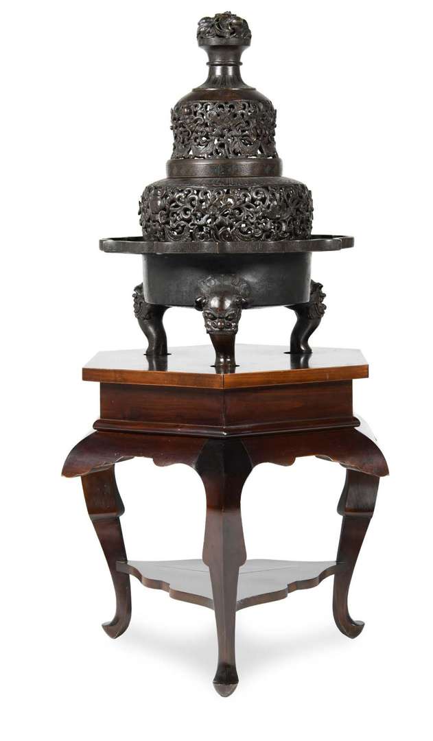 Grand brûle-parfum tripode couvert, en bronze de patine brune, la paroi divisée en deux zones horizontales par une large collerette plate polylobée, la partie haute ajourée de rinceaux de lotus, de même que le couvercle surmonté d'une prise ajourée de fruits et feuillages | la partie basse sans décor, portée par trois pieds crachés par des têtes de félin. Sur une sellette hexagonale en bois à pieds galbés.