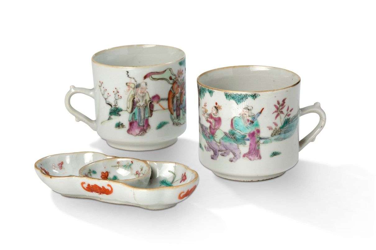 Lot comprenant deux tasses et un petit ravier en porcelaine et émaux de la famille rose, à décor d'une scène d'offrande à Zhoulao, et décor floral.