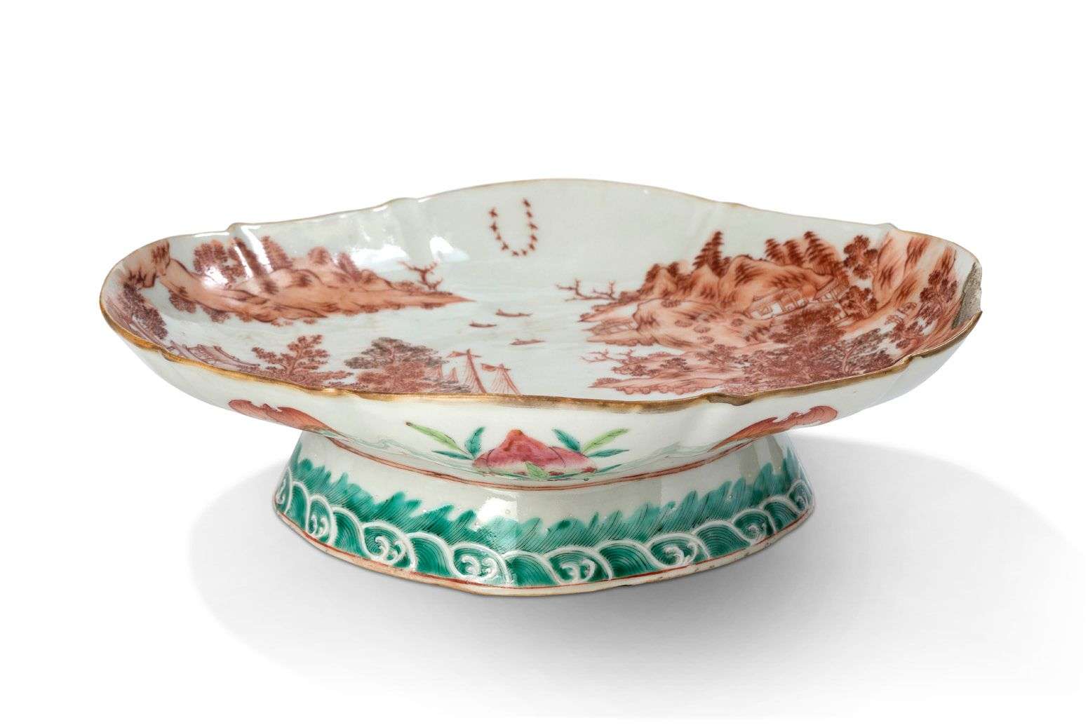 Ravier floriforme sur piédouche en porcelaine, à décor émaillé corail d'une cité lacustre animée de personnages, sur fond de pics montagneux, le pourtour à décor de chauves-souris et pêches de longévité au-dessus de flots écumants.
