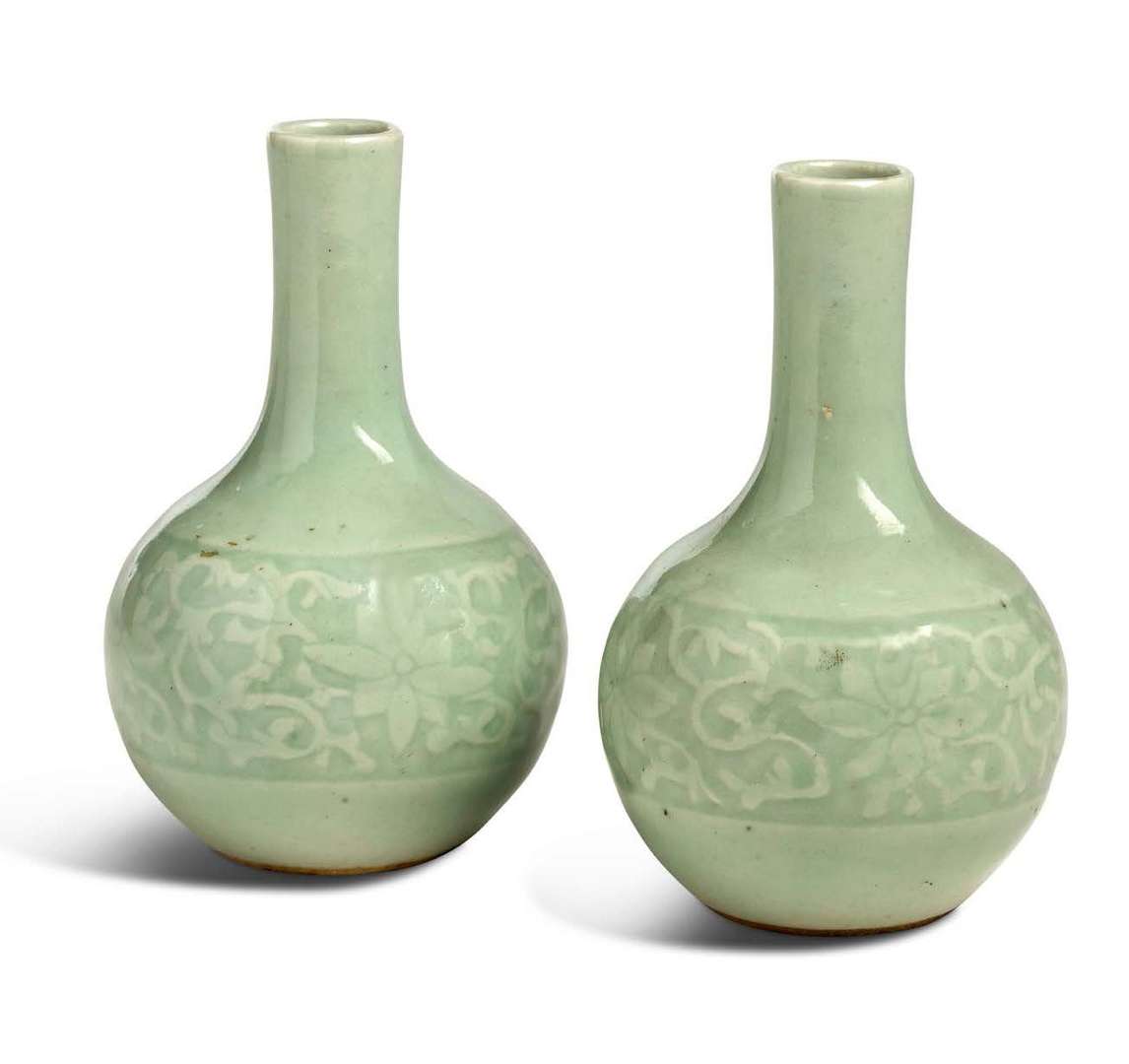 Paire de petits vases tianqiuping en porcelaine et émail céladon, à décor sous couverte de fleurs de lotus et rinceaux feuillagés.