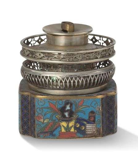 Lampe de fumeur d'opium en paktong et émaux cloisonnés sur cuivre, à décor d'objets mobiliers. Marque d'atelier sur la base.