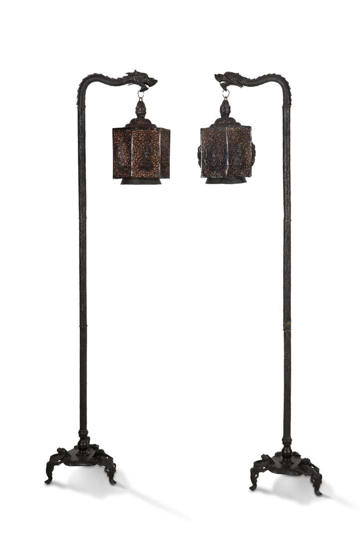 Paire de lanternes de temple, de forme hexagonale, en métal laqué noir, à décor ajouré et repoussé, chaque face figurant une divinité à quatre bras dansant sur un lotus parmi des rinceaux floraux, la lanterne couronnée par une tête de Mahakala surmontée d'un anneau de suspension, permettant de l'accrocher à un haut fût en métal laqué noir, orné au repoussé d'un dragon s'enroulant sur la hauteur, à la tête duquel se fixe la lanterne.