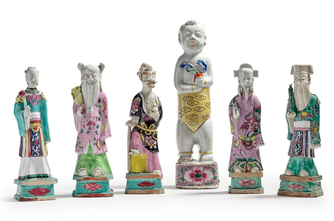 Cinq statuettes en biscuit et émaux de la famille rose représentant une partie des huit immortels. On y joint une statuette en porcelaine émaillée polychrome représentant un des frères Hoho tenant un vase aux fleurs de lotus.