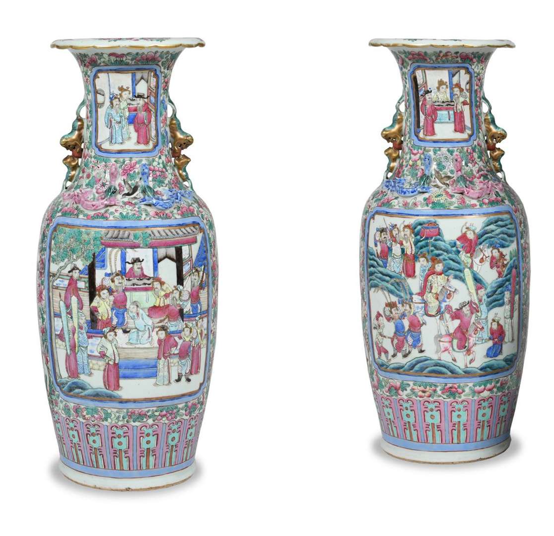 Paire de grands vases en porcelaine et émaux de la famille rose, à décor inversé, figurant des scènes animées de personnages dans un intérieur ou un paysage, dans des réserves sur fond de fleurs, fruits et oiseaux, le col et l'épaule ornés en haut relief de chilong et félins.