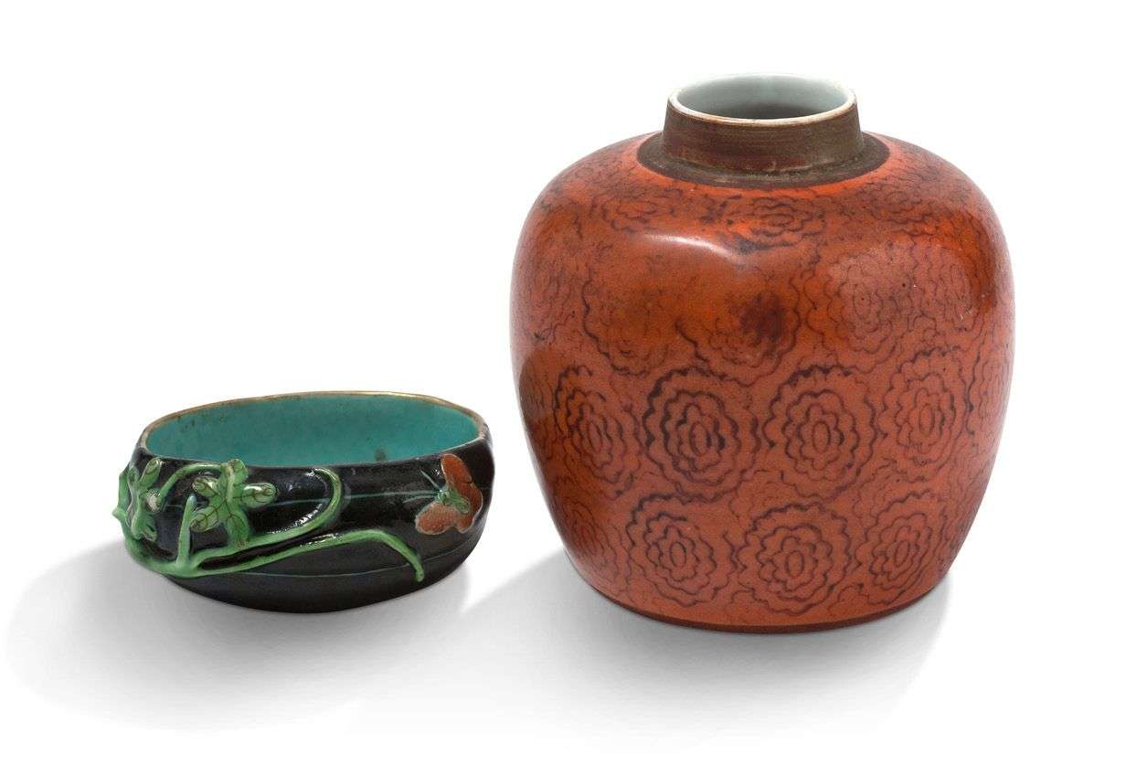 黑釉瓷瓜形笔洗及珊瑚釉仿木纹小罐