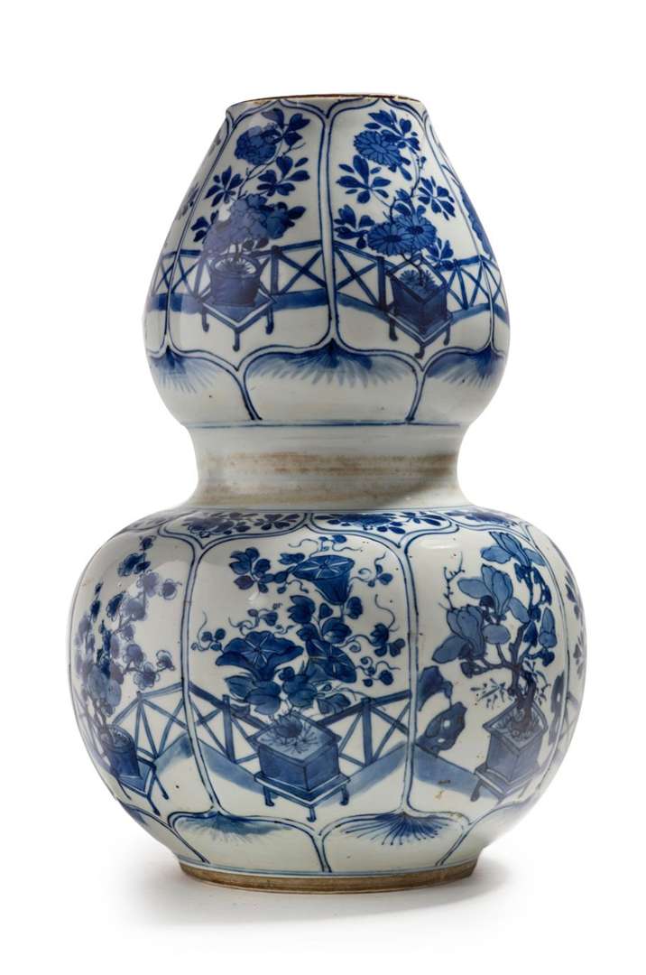 Vase coloquinte en porcelaine bleu blanc, à décor sous couverte de compositions florales, fleurs et végétaux à l'intérieur de pétales de lotus Marque à la feuille sur la base.