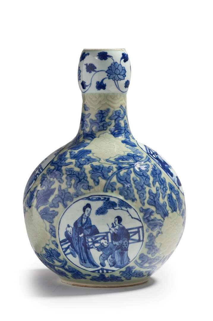 Vase à panse sphérique en porcelaine à décor en bleu sous couverte de médaillons animés de femmes et enfants sur un fond céladon orné en léger relief de rinceaux de pivoines bleu. Le col orné de rinceaux de lotus.