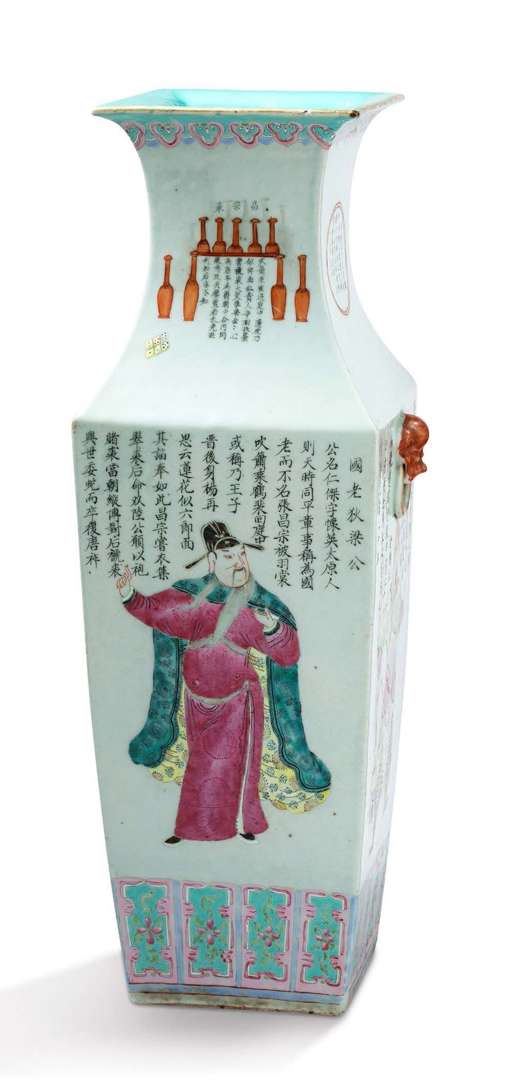 Grand vase balustre rectangulaire en porcelaine et émaux de la famille rose, à décor de type Wu Shuang Pu, chaque face représentant un personnage célèbre de l'histoire de la Chine, Wu Zetian, Guo Ziyi, Di Liang Gong, Sun Quan, chacun accompagné d'une inscription l'identifiant| l'épaule rehaussée de deux masques zoomorphes émaillés corail, tenant des anneaux fixes | l'ouverture et la base respectivement soulignées d'une frise de têtes de ruyi et de pétales de lotus stylisés.