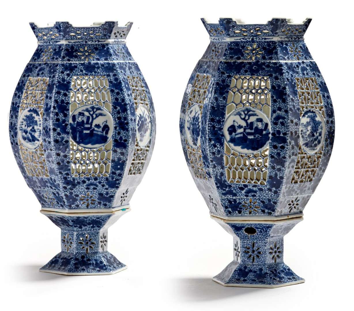 Paire de lanternes en deux parties, en porcelaine bleu-blanc à décor ajouré en médaillons de scènes de paysages animées de personnages parmi des fleurs épanouies.